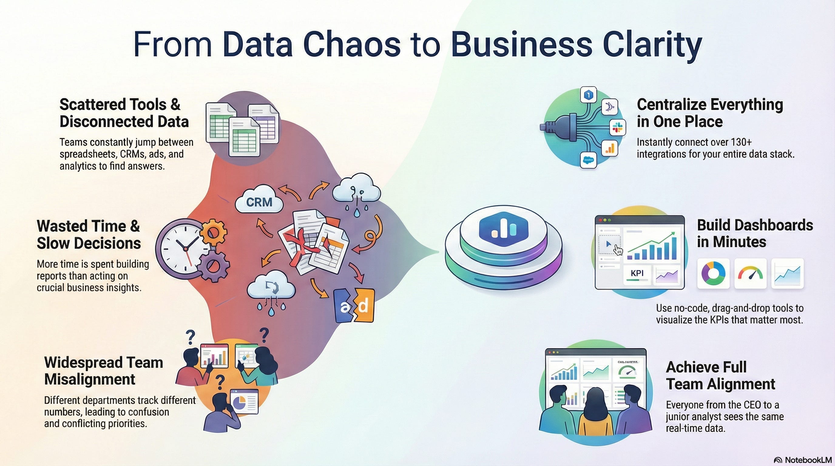 The most common pain point for modern teams isn’t having too little data; it’s having too much of it scattered across dozens of disconnected tools. Team members are constantly jumping between Google Analytics, HubSpot, Stripe, various CRMs, ad platforms, and messy, outdated spreadsheets just to piece together a coherent picture of performance.